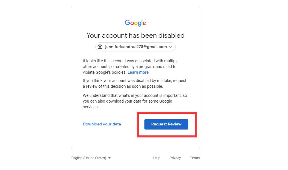 2、在提醒被封禁的页面,选择“Request Review”按钮提交申诉;如下图: