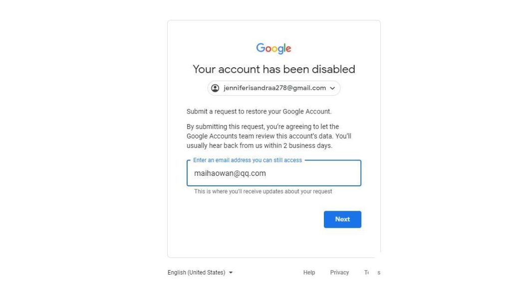 3、在申诉联系你的地址输入接受通知的邮箱,是否会成功会通过你输入的邮箱给你发送邮件提醒。